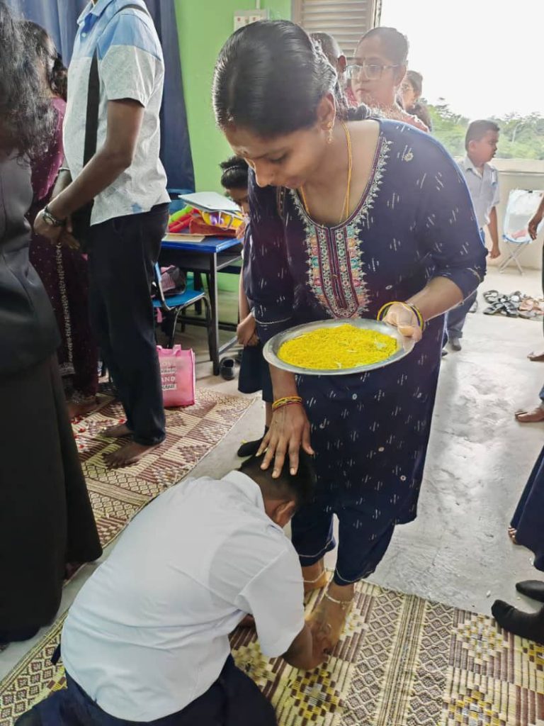 பெற்றோர் மாணவர்களின் கரங்களைப் பற்றி அரிசி பரப்பிய தட்டில் அகரம் எழுதிப் பயிற்றினர். அதன் பின்னர் மாணவர்கள் தம் பெற்றோரிடம் வாழ்த்து பெற்றனர். பெற்றோர் பிள்ளைகளை மலர் தூவி வாழ்த்தினர்.
