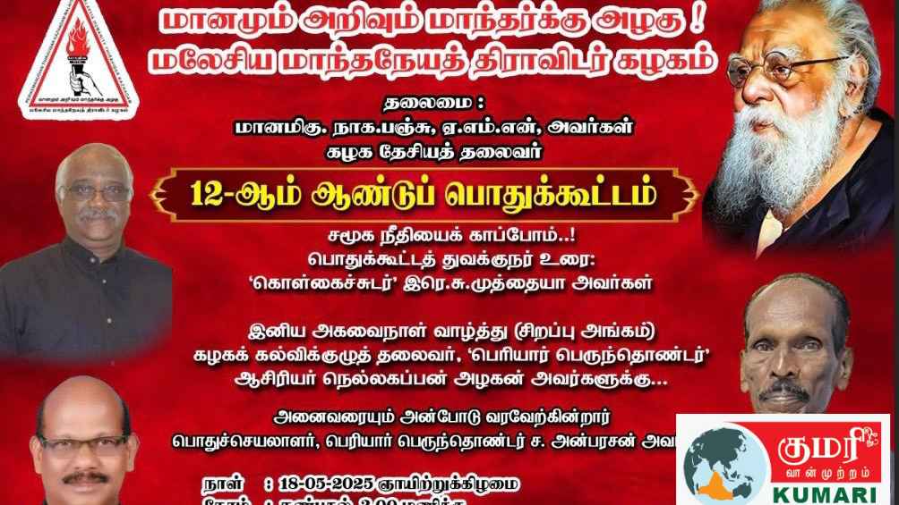 மலேசிய மாந்தநேய திராவிடர் கழகத்தின் 12 ஆம் ஆண்டுக் கூட்டம் அதன் தேசிய தலைவர் நாக பஞ்சு தலைமையில் இன்று, ஞாயிற்றுக்கிழமை மே 18, பிற்பகல் 2:30 மணி அளவில் நடைபெற இருக்கிறது.