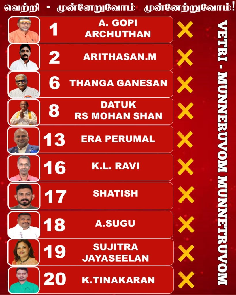 மலேசிய இந்து சங்கத்தில் இளைஞர்கள் தலைமைத்துவத்திற்கு வரவேண்டும் என்பதால் தங்களுடைய அணியில் அதிகமான இளைஞர்களின் சேர்த்துக் கொண்டிருப்பதாகவும் ஏ. கோபி அச்சுதன், எம். ஹரிதாசன், டத்தோ ஆர் எஸ் மோகன்ஷான், கே எல் ரவி, சதீஷ், ஏ சுகு, சுஜித்ரா ஜெயசீலன், கே தினகரன் ஆகியோருடன் தானும் போட்டியிடுவதாக தங்க கணேசன் நேற்றைய செய்தியாளர் கூட்டத்தில் அறிவித்தார்.