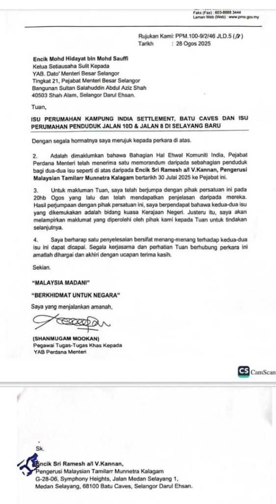 பிரதமர் துறை அலுவலகத்தில் இந்திய சமுதாய பிரதிநிதியாக செயல்படும் அதிகாரி சண்முகம் மூக்கன், இந்தச் சிக்கல் தொடர்பில் சிலாங்கூர் மாநிலச் செயலாளர் முகமது ஹிடாயாத் முகமது சௌஃபிக்கு கடந்த ஆகஸ்ட் மாதம் அனுப்பிய கததத்தில் மலேசியத் தமிழர் முன்னேற்றக் கழகத் தலைவருமான சேரன் பிரதமர் அலுவலகத்தில் வழங்கிய கோரிக்கை மனுகுறித்து, உரிய நடவடிக்கை எடுக்கும்படி கேட்டிருந்தார்.