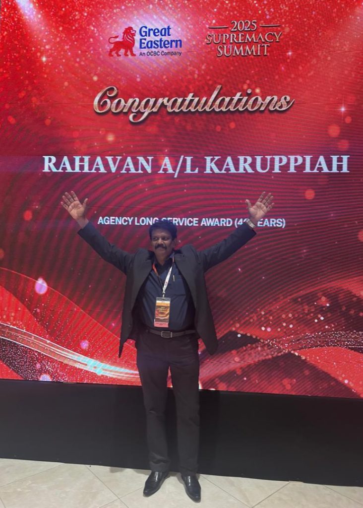 தொடர்ந்து 40 ஆண்டுகளாக காப்புறுதித் துறையில் கோலோச்சிவரும் ராகவன் கருப்பையாவுக்கு, அவர் சார்ந்துள்ள ‘கிரேட் ஈஸ்டர்ன்’ ஆயுள் காப்புறுதி. நிறுவனம் இரு தினங்களுக்கு முன் ‘நீண்டகால சேவை’க்-கான விருதை வழங்கி கௌரவம் செய்தது.