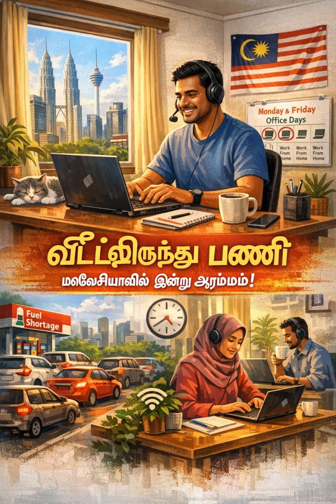 மலேசியாவைப் பொறுத்தவரை, இரண்டு நாட்கள் மட்டும் அலுவலகத்திற்குச் செல்ல வேண்டும். திங்களும் வெள்ளியும் அலுவ-லகத்திற்குச் செல்ல வேண்டும்; இடையில் மூன்று நாட்கள் வீட்டில் இருந்தே பணிபுரியும் நடைமுறை மலேசியாவில் இன்றுமுதல் அமலுக்கு வருகிறது.